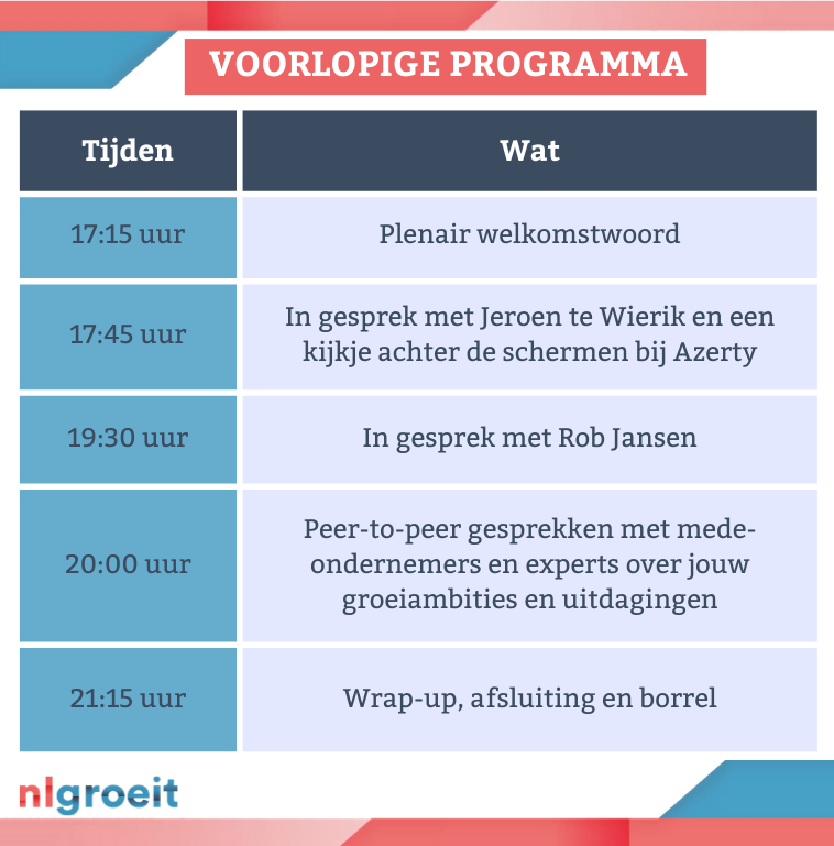 Nlgroeit-events zijn gratis voor onze leden. Niet leden betalen €75,- voor een ticket een week voor aanvang van het event. Daarna betaal je €99,-.