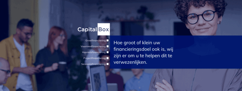 CapitalBox biedt ondernemers de oplossing voor de vraag naar groei- en werkkapitaalfinanciering. Bij ons kunt u online eenvoudig en snel financiering aanvragen. Wij geven binnen één werkdag terugkoppeling op de aanvraag zodat u direct weet waar u aan toe bent. We vragen niet om zakelijke zekerheden, hanteren transparante voorwaarden en staan voor een persoonlijke service. We vertrekken zakelijke financiering tot €350.000,- met een maximale looptijd van 36 maanden.
